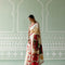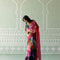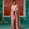 Set on an ecru base with a green and pink paisley print, the saree is elevated with delicate pearl tassels at the ends of the pallu for a graceful finish. A contrast facing along the border adds depth and refinement, making this drape a versatile choice for both festive and intimate gatherings.