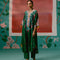 Set on a vibrant fuschia striped base with bold florals, the kaftan is elevated with intricate metal lace hand embroidery on the yoke, adding a touch of artisanal richness. A delicate lace border along the sleeves and hemline frames the silhouette with elegance, making this set a perfect blend of striking color, comfort, and celebration-ready charm.