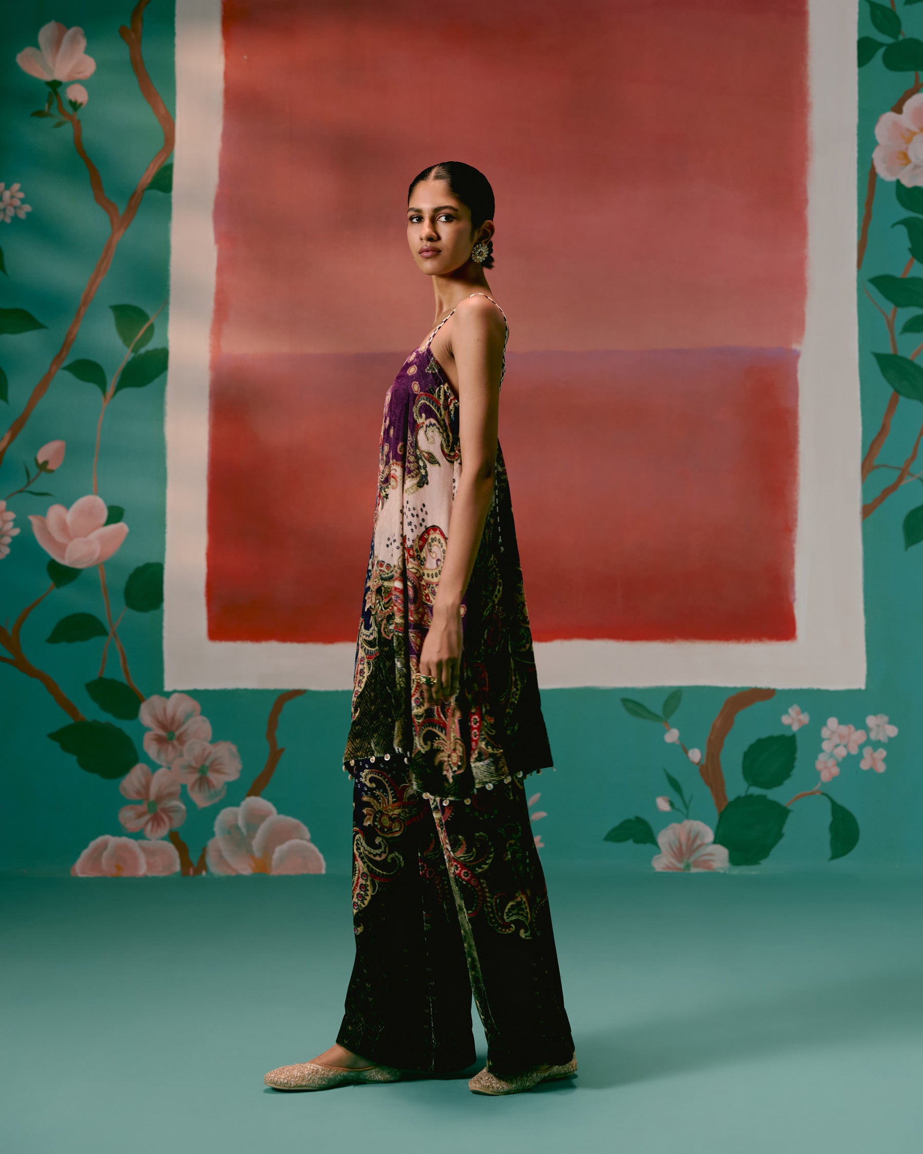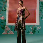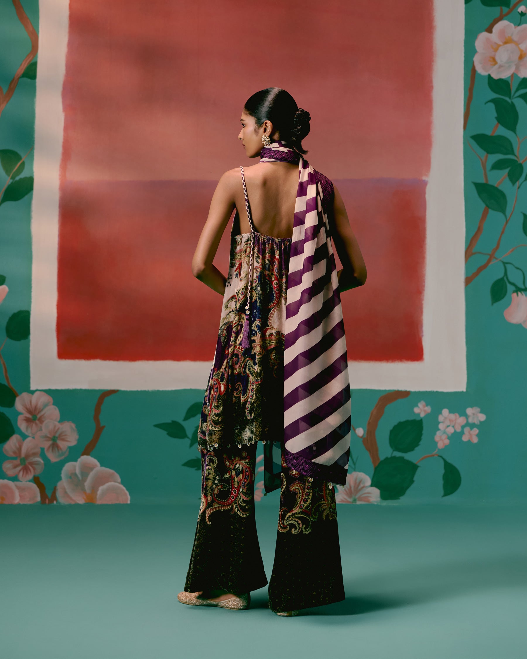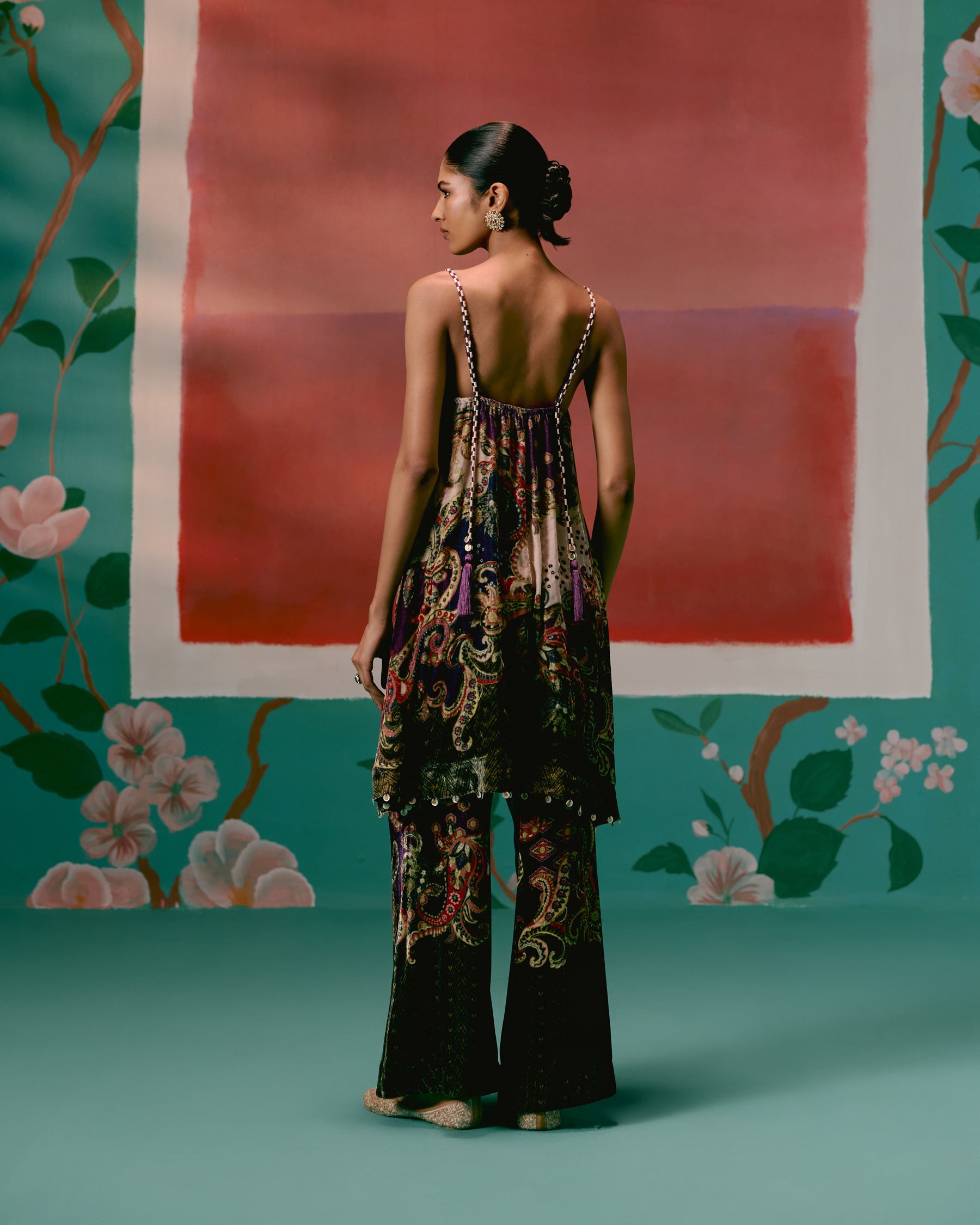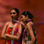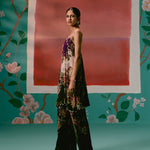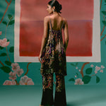 Featuring a paisley print with olive & purple accents, the strappy sleeveless kurta is detailed with hand-braided silk thread straps, adjustable with tassel tie-ups for ease and charm. An inbuilt bustier with a smocked back and elasticated front waist ensures both structure and comfort, while shell-and-metal hangings along the hemline add artisanal depth. Paired with dramatic bell-bottom pants and a printed organza dupatta , this set is designed for those who love a bold yet refined festive statement.
