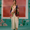 The blazer is designed on an ecru base with an all-over paisley print. Paired with a solid ecru bustier featuring an elasticated back, adjustable straps, metal hangings at the waist, and delicate beaded hand embroidery along the neckline, it balances structure with artisanal detail. The dhoti skirt, styled in a fluid draped silhouette with an elasticated back, completes the look—offering a bold yet elegant take on festive dressing.