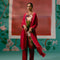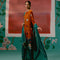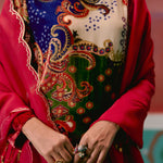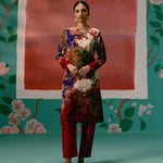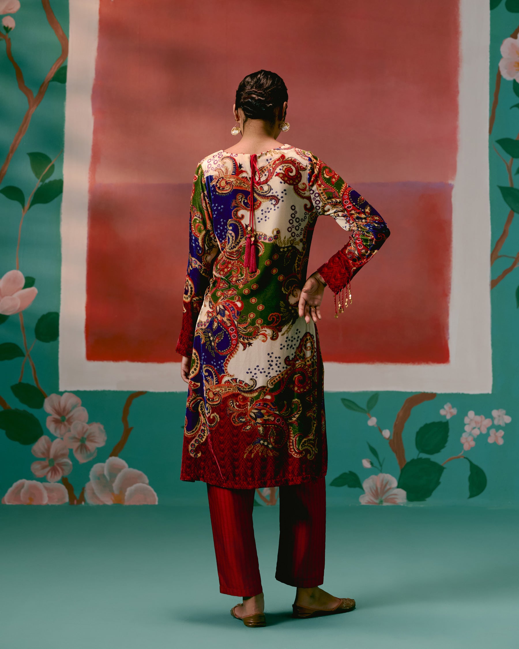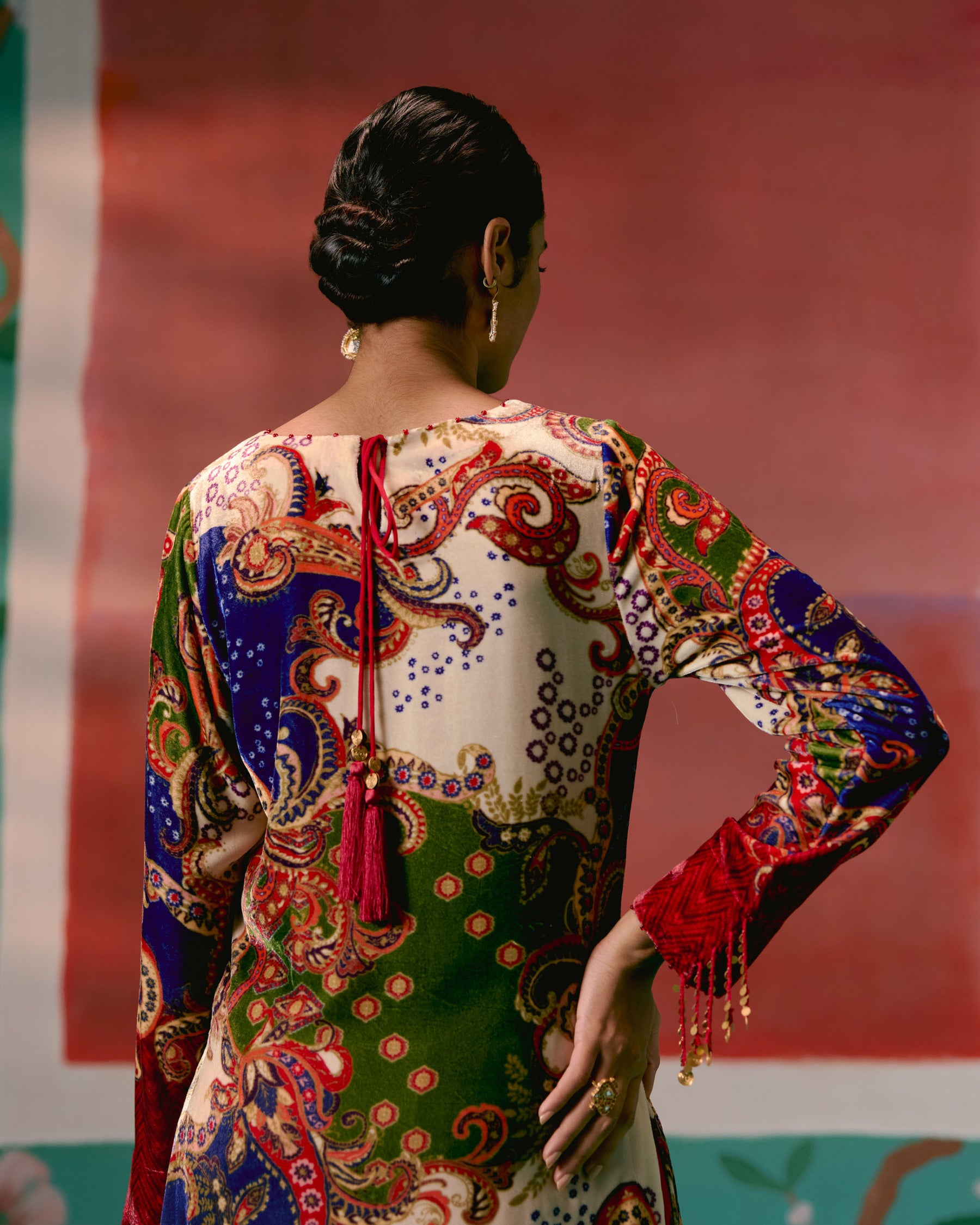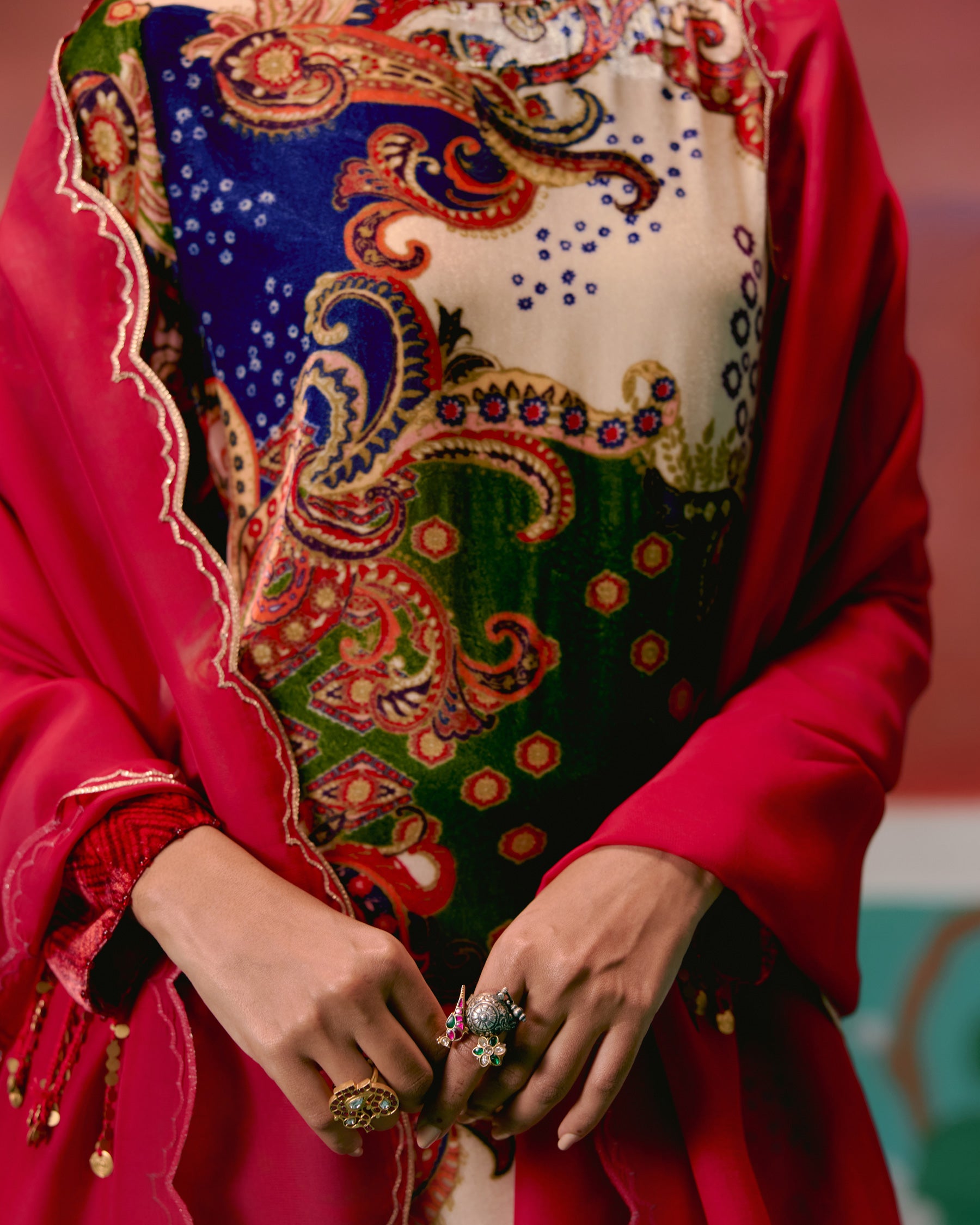 Designed on an ecru base with paisleys in rich, deep tones, the kurta is detailed with hand-embroidered metal coins along the sleeve edges and handmade tassels at the back. A contrast facing lends subtle refinement, while the organza dupatta elevates the look with a scalloped edge along its border. Completed with straight pants featuring an elasticated back, this set is a perfect balance of luxury and comfort—crafted to make every celebration feel special.