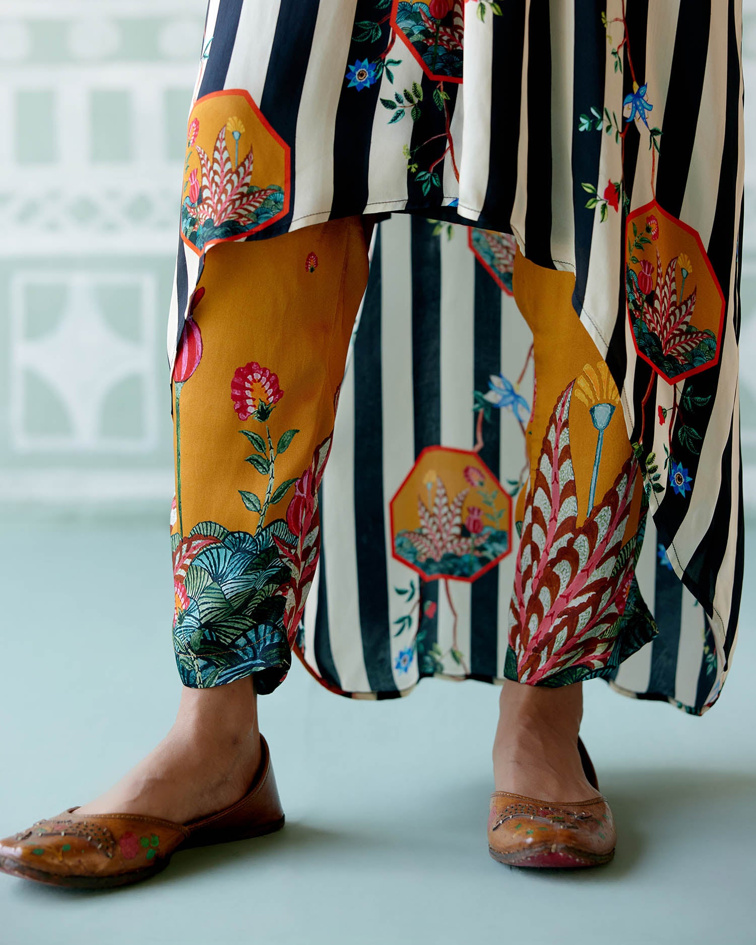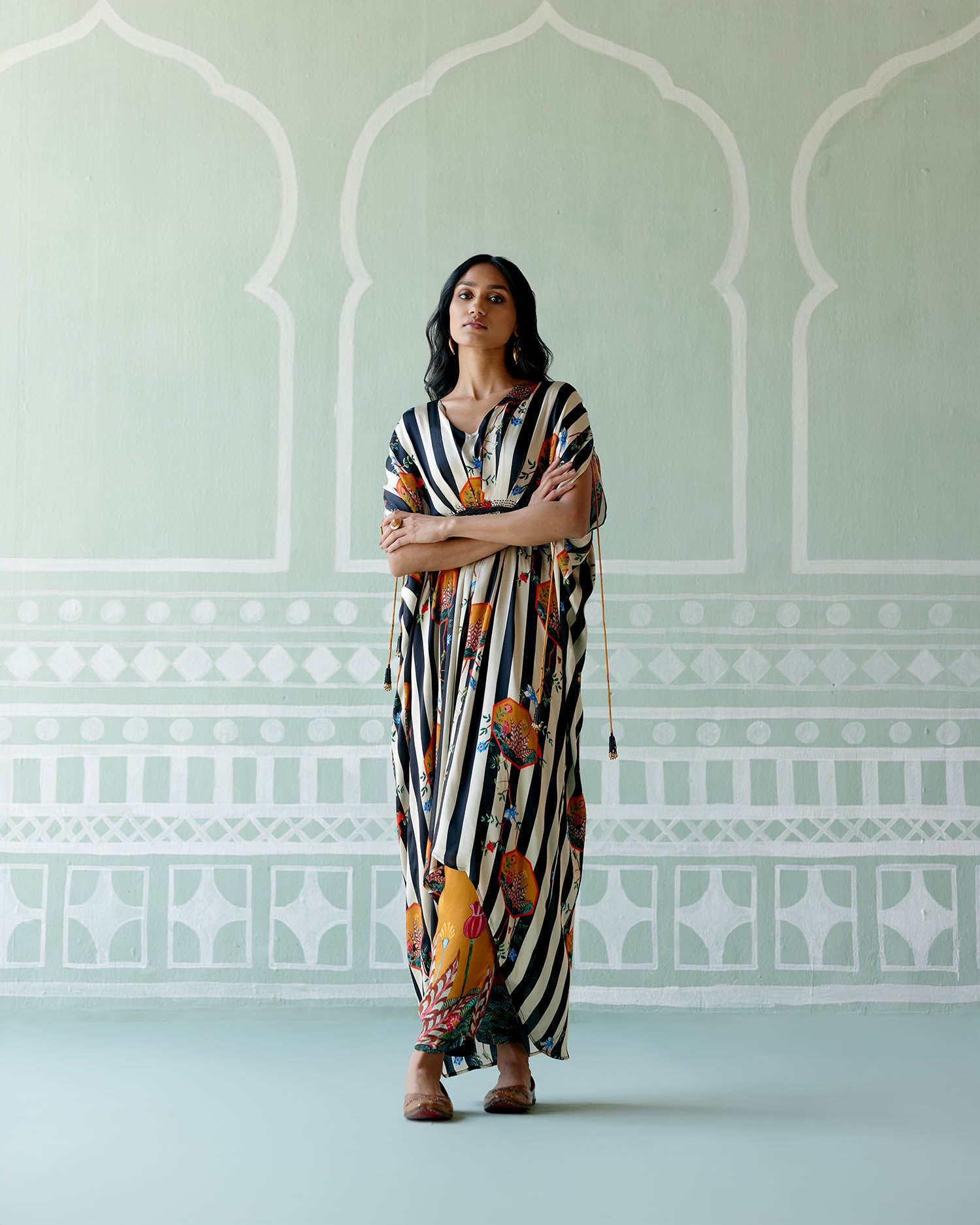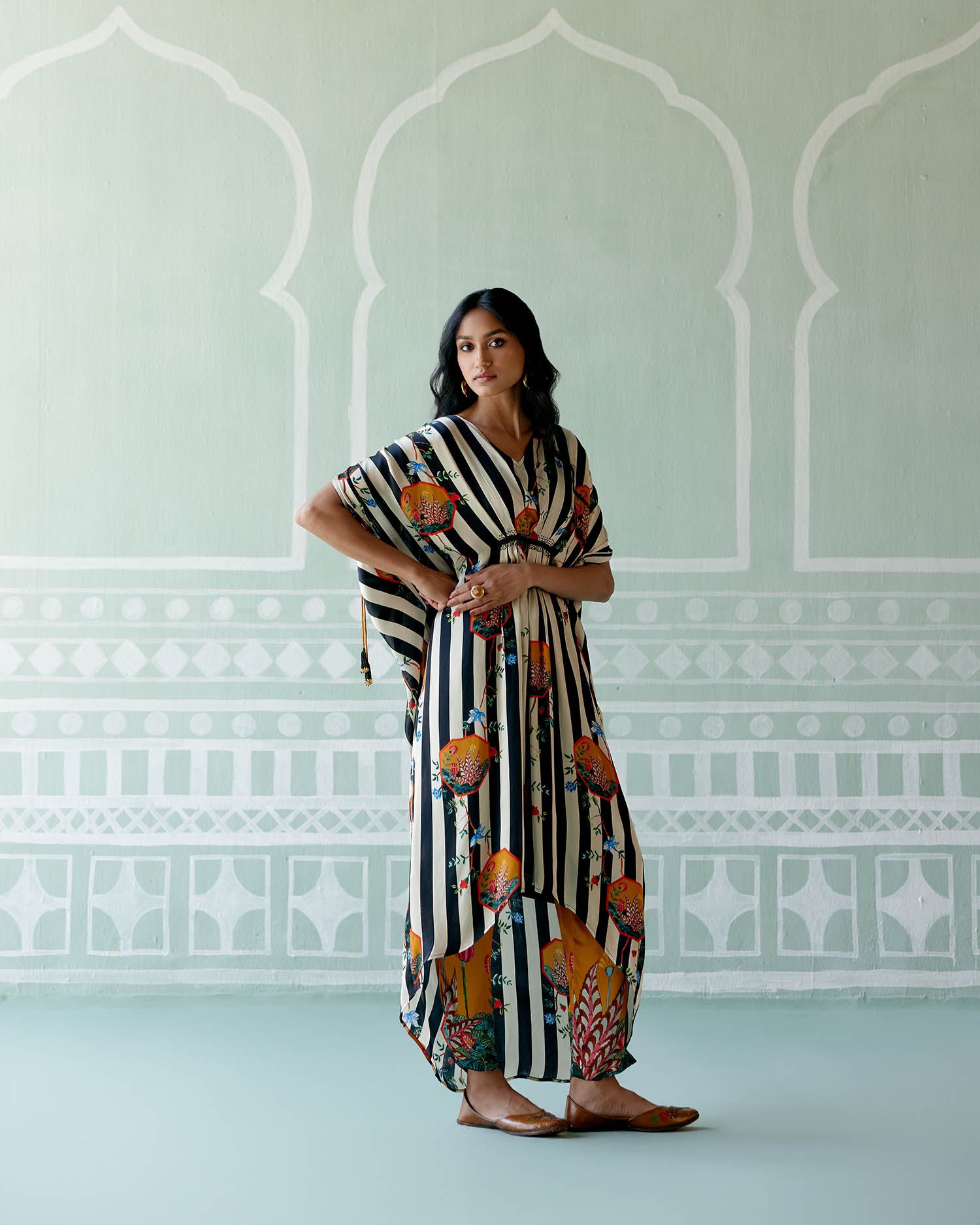 A perfect blend of comfort and grandeur, the Black & White Striped Kaftan Set is the must-have product of the season. Crafted from the finest satin and adorned with exquisite detailing, this kaftan is designed to turn heads and make a statement this festive season.