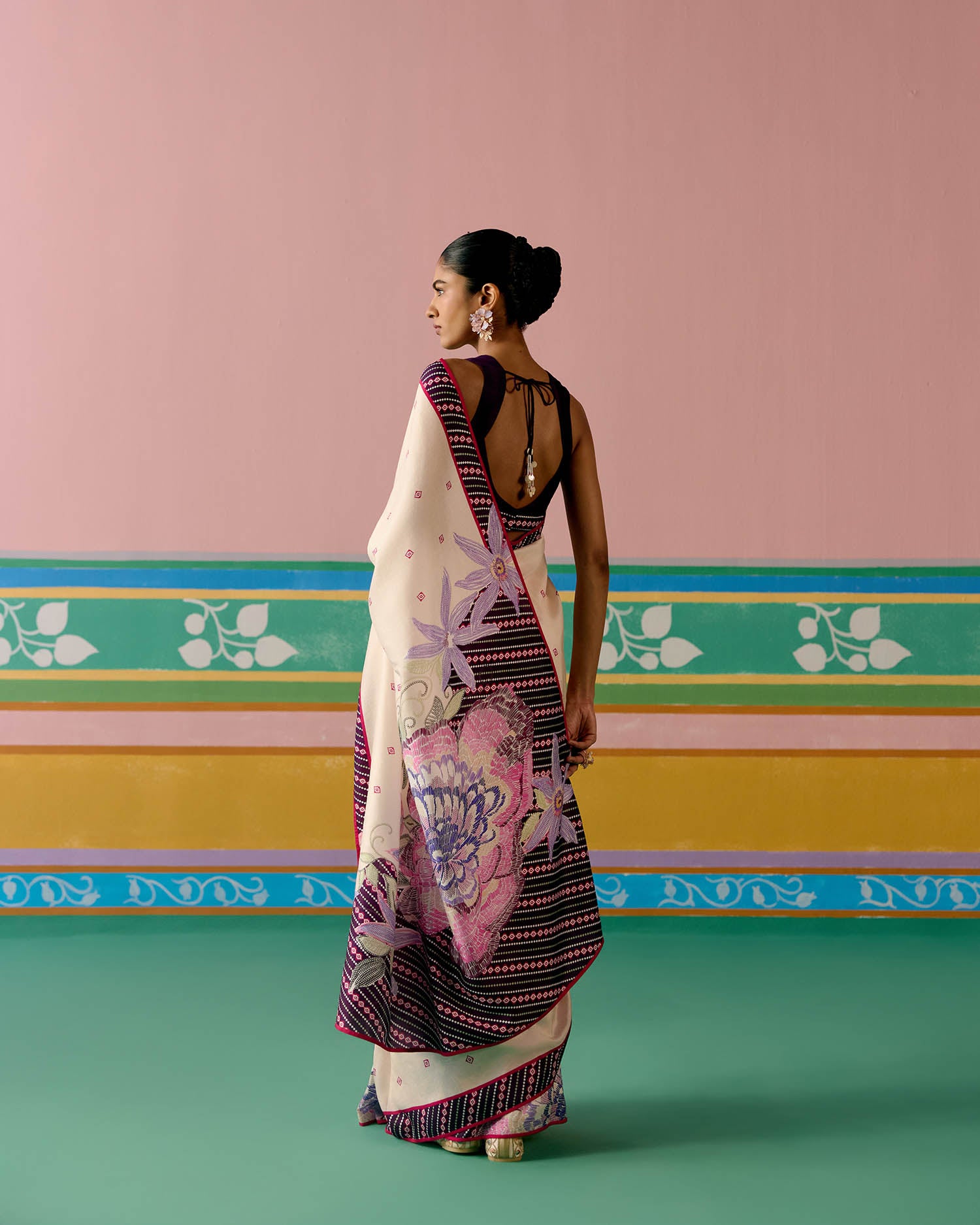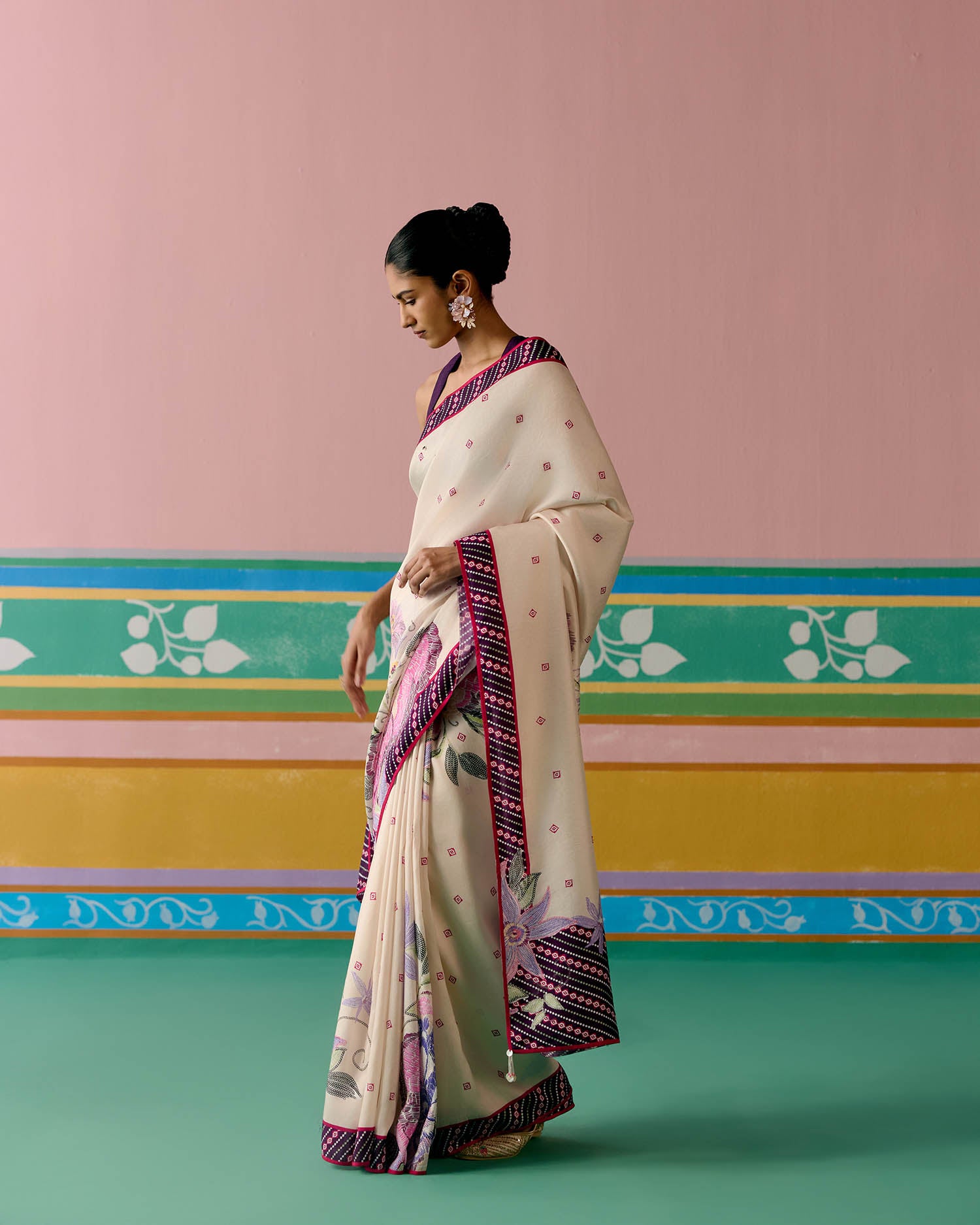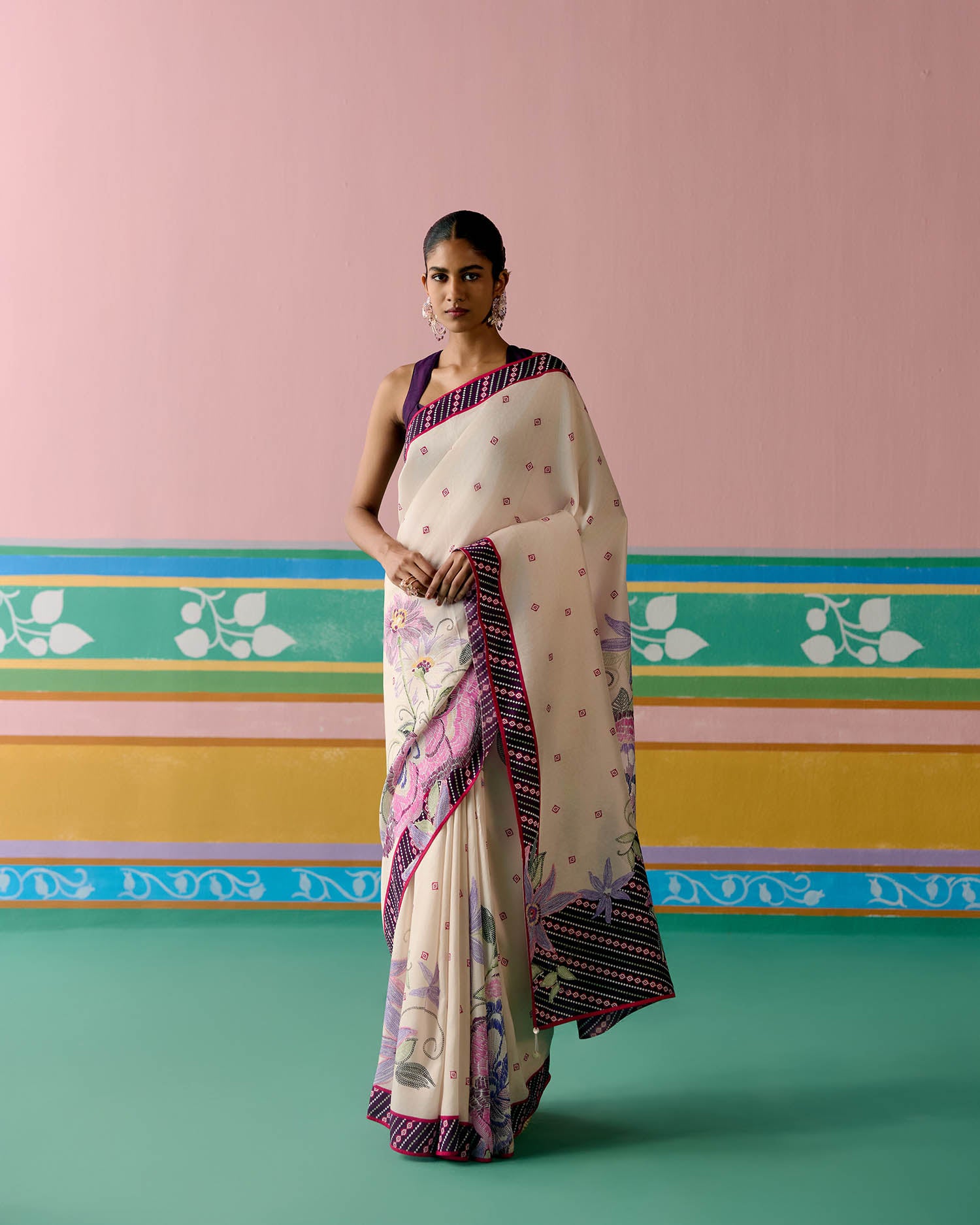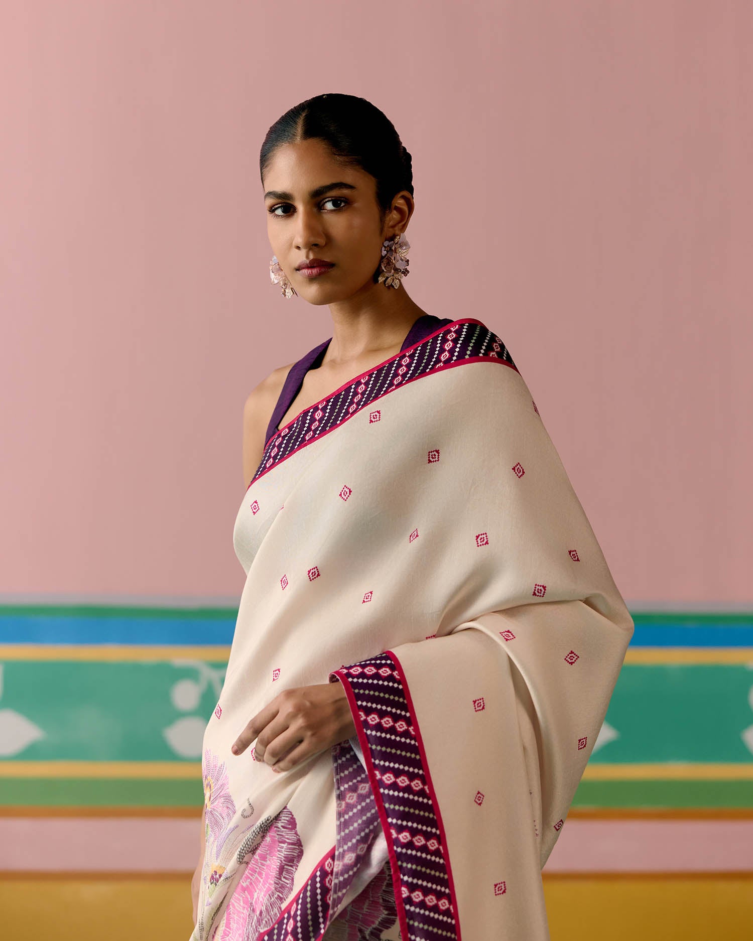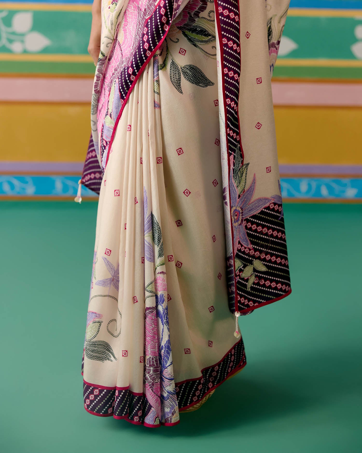 Set on an ecru base with a striking purple ikkat print, the saree is elevated with delicate pearl tassels adorning the pallu for a graceful finish. A contrast facing along the border adds depth and definition, making this drape a perfect balance of tradition and modern charm.