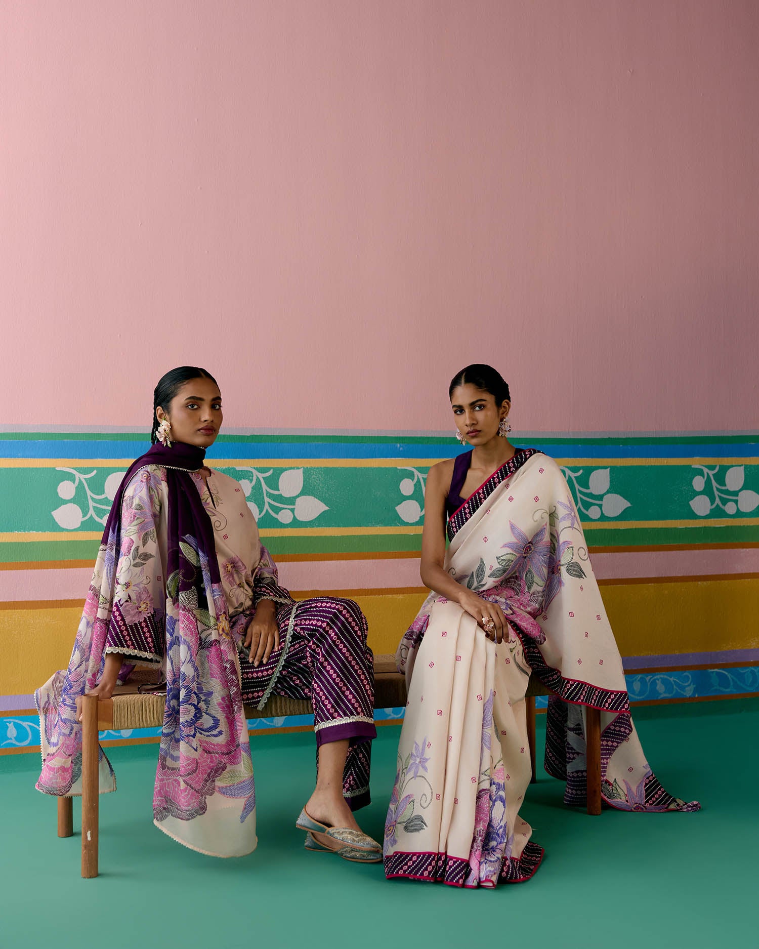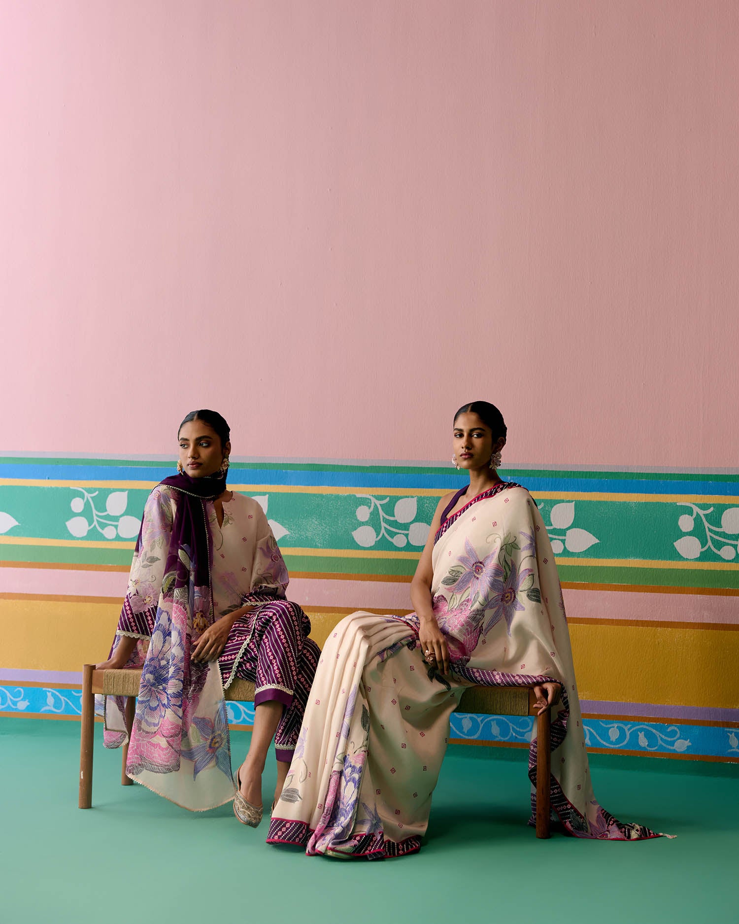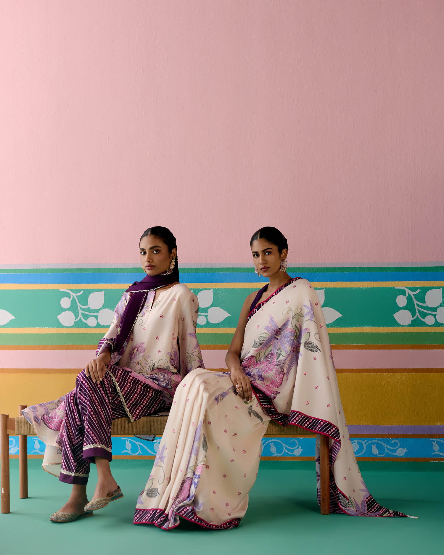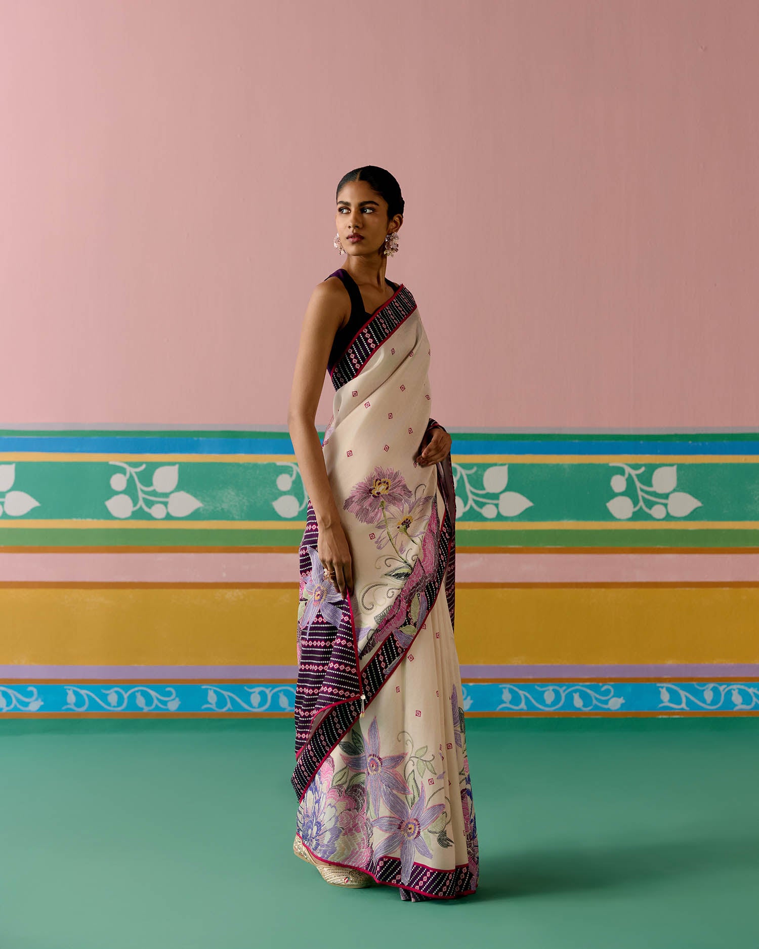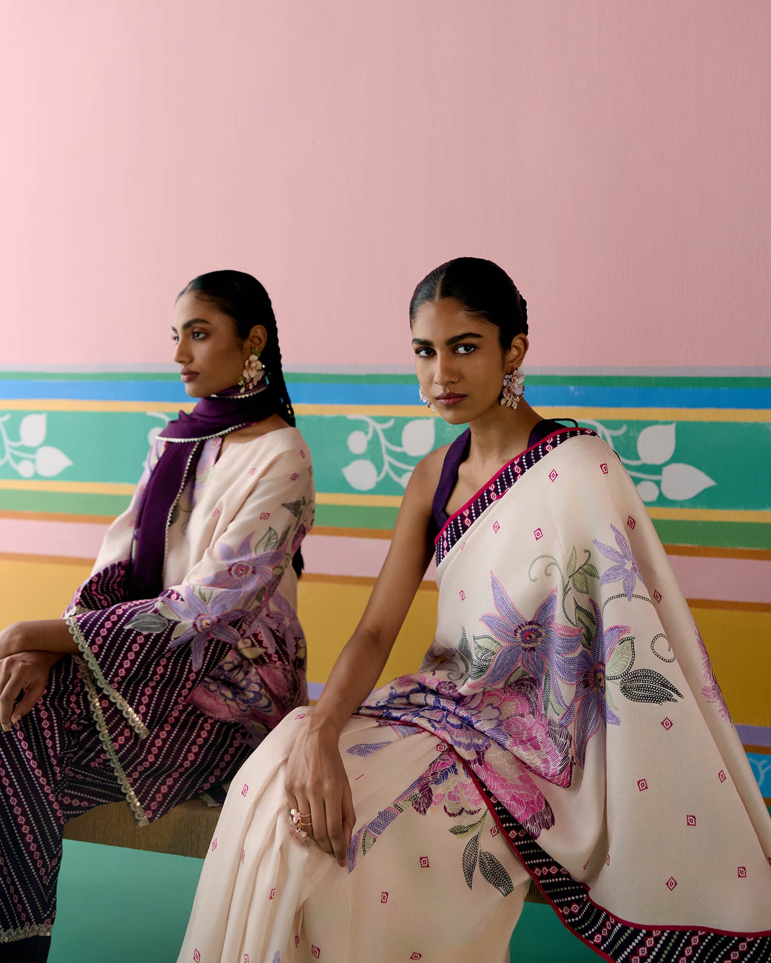 Set on an ecru base with a striking purple ikkat print, the saree is elevated with delicate pearl tassels adorning the pallu for a graceful finish. A contrast facing along the border adds depth and definition, making this drape a perfect balance of tradition and modern charm.