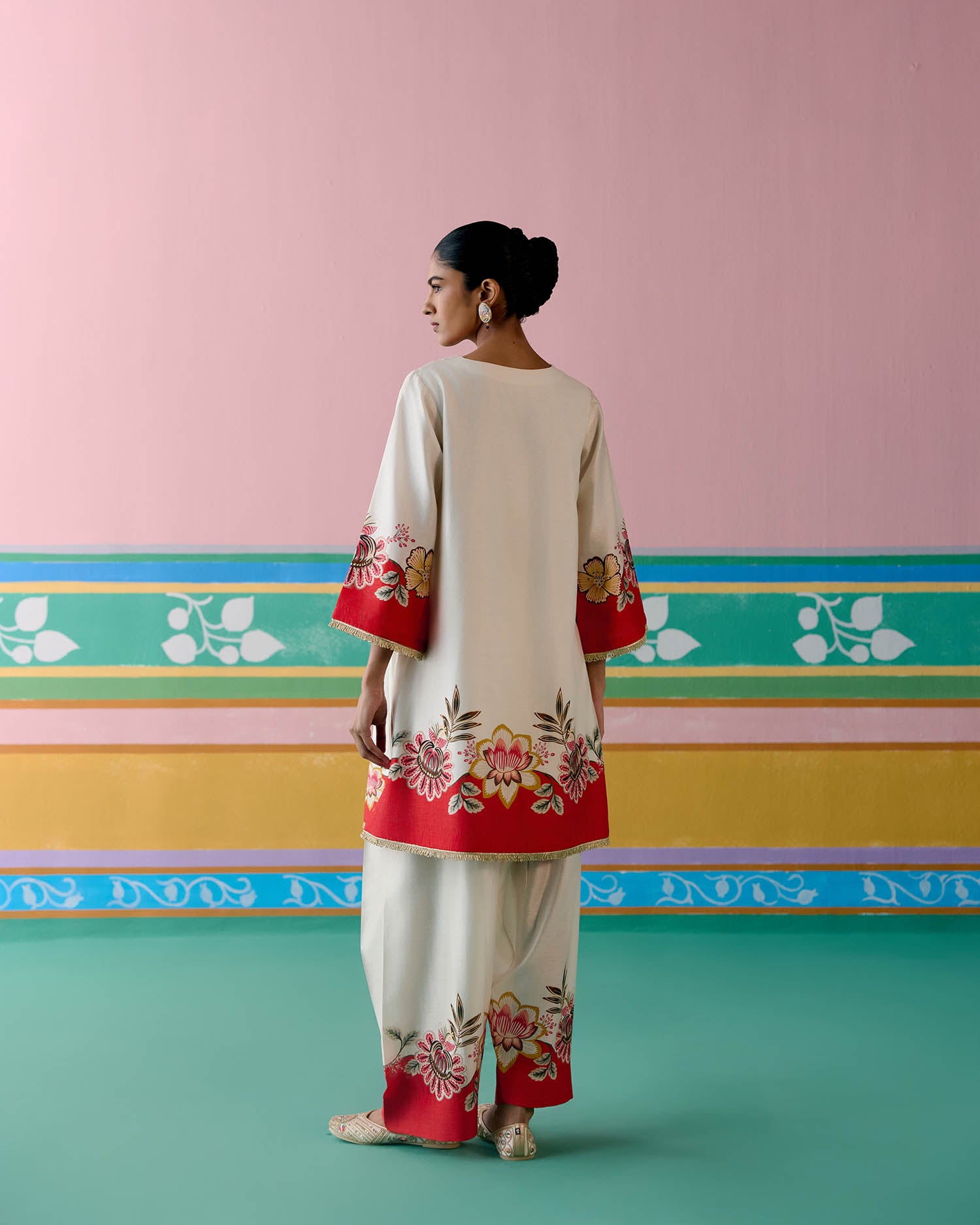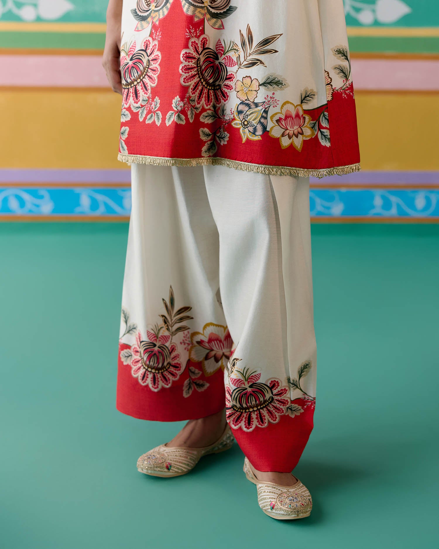 Tailored in airy Chanderi, the kurta is adorned with intricate lace detailing along the neckline, sleeves, and hem, finished with playful tassels for a hint of whimsy. The fully elasticated farsi-style pants offer ease of movement without compromising on elegance—making this set a perfect choice for both daytime festivities and evening soirees.
