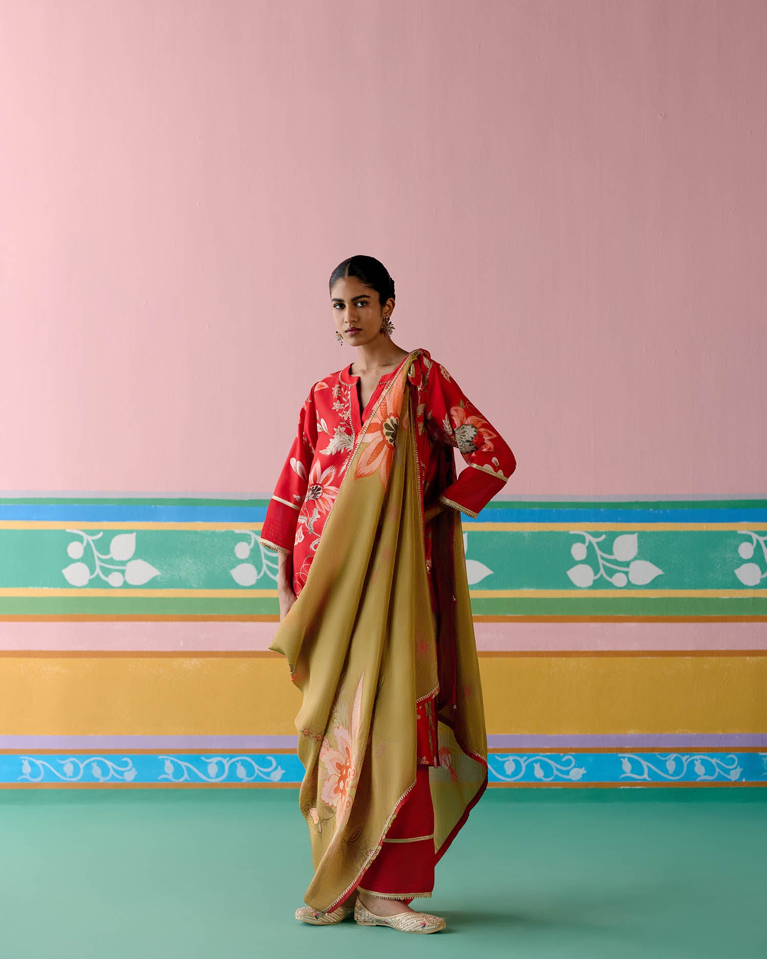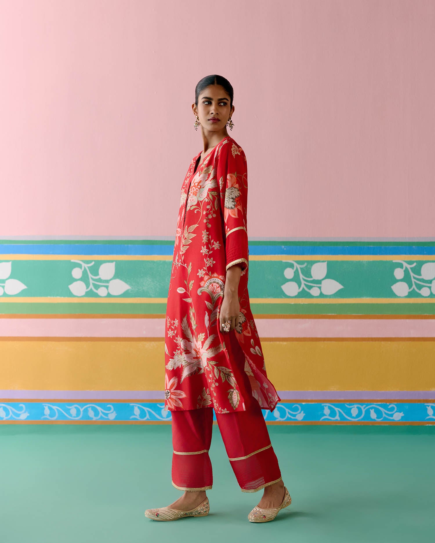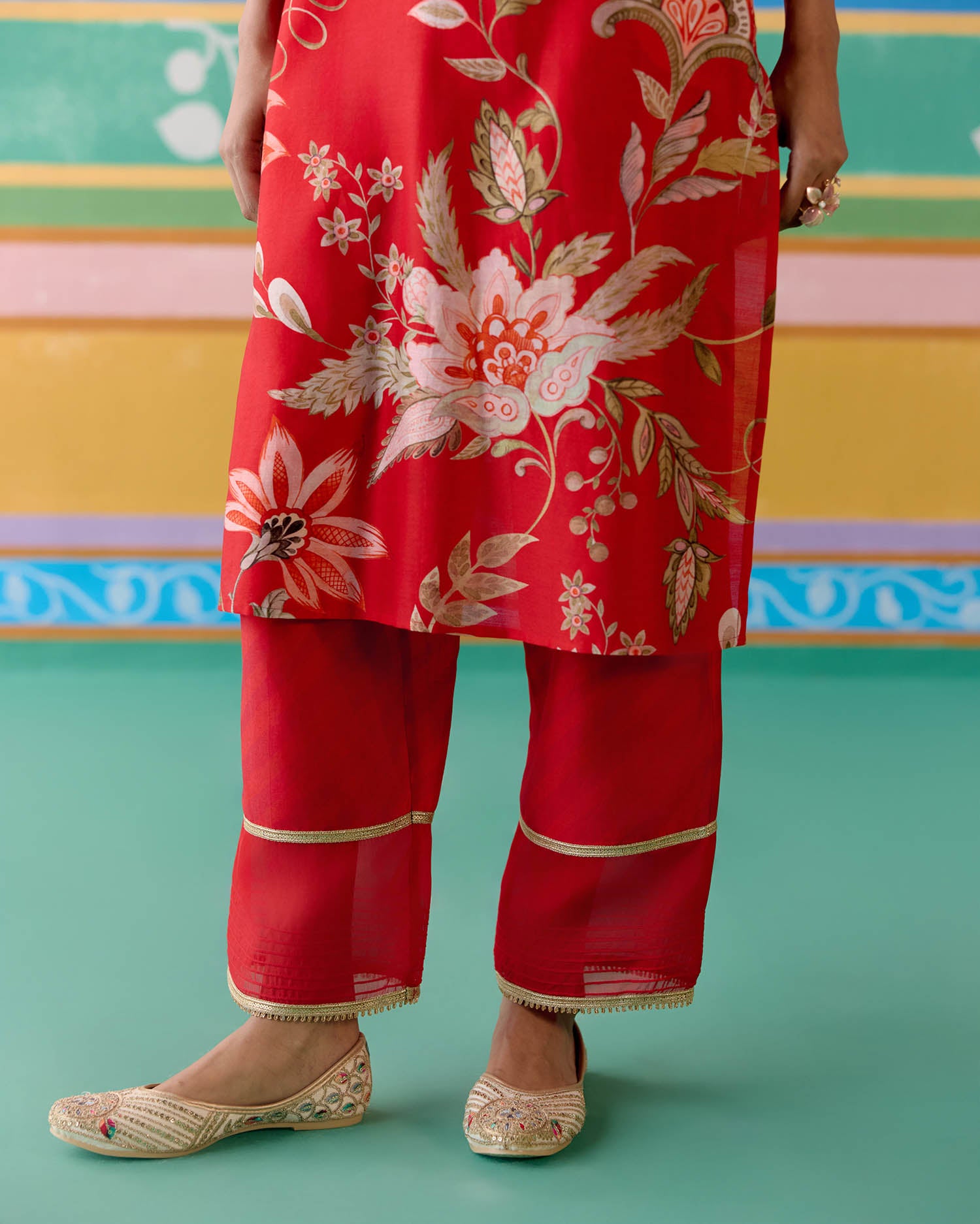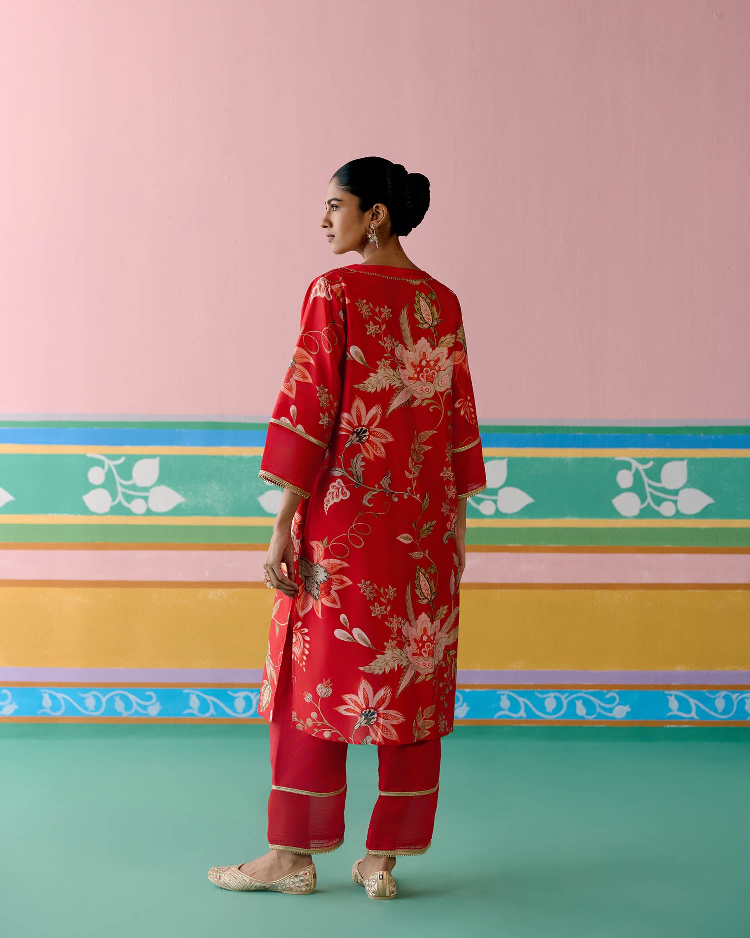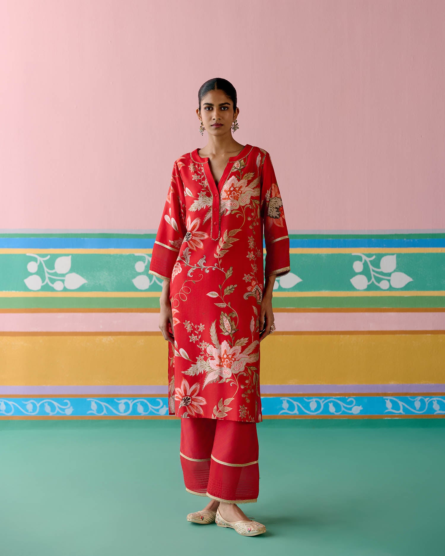 Elegant yet contemporary, the Red Chintz V-neck Kurta Set is a true festive standout. Crafted in airy Chanderi with delicate organza detailing on the sleeves and pants, the kurta is elevated with lace inserts along the neckline and sleeves.
