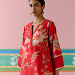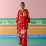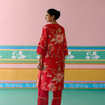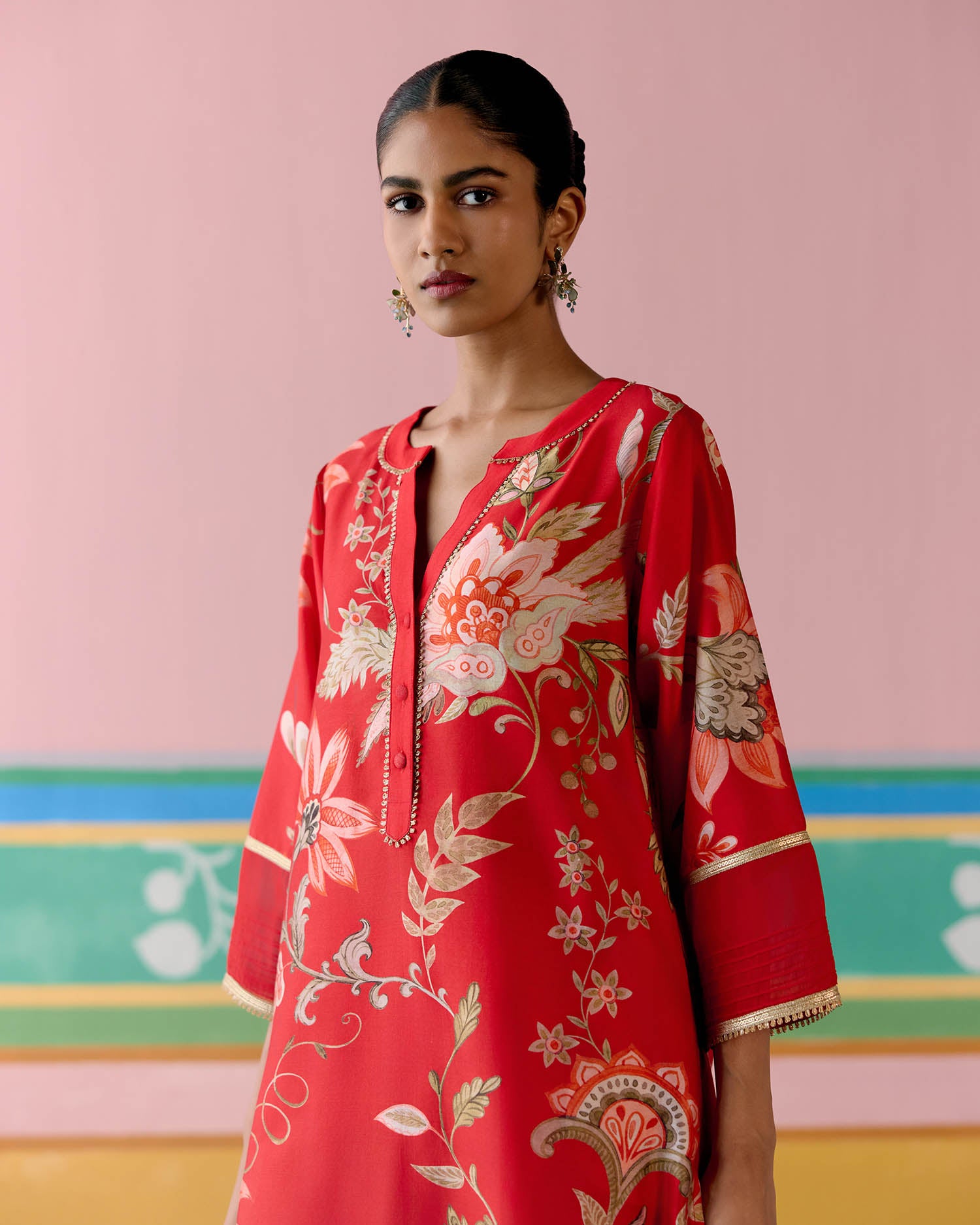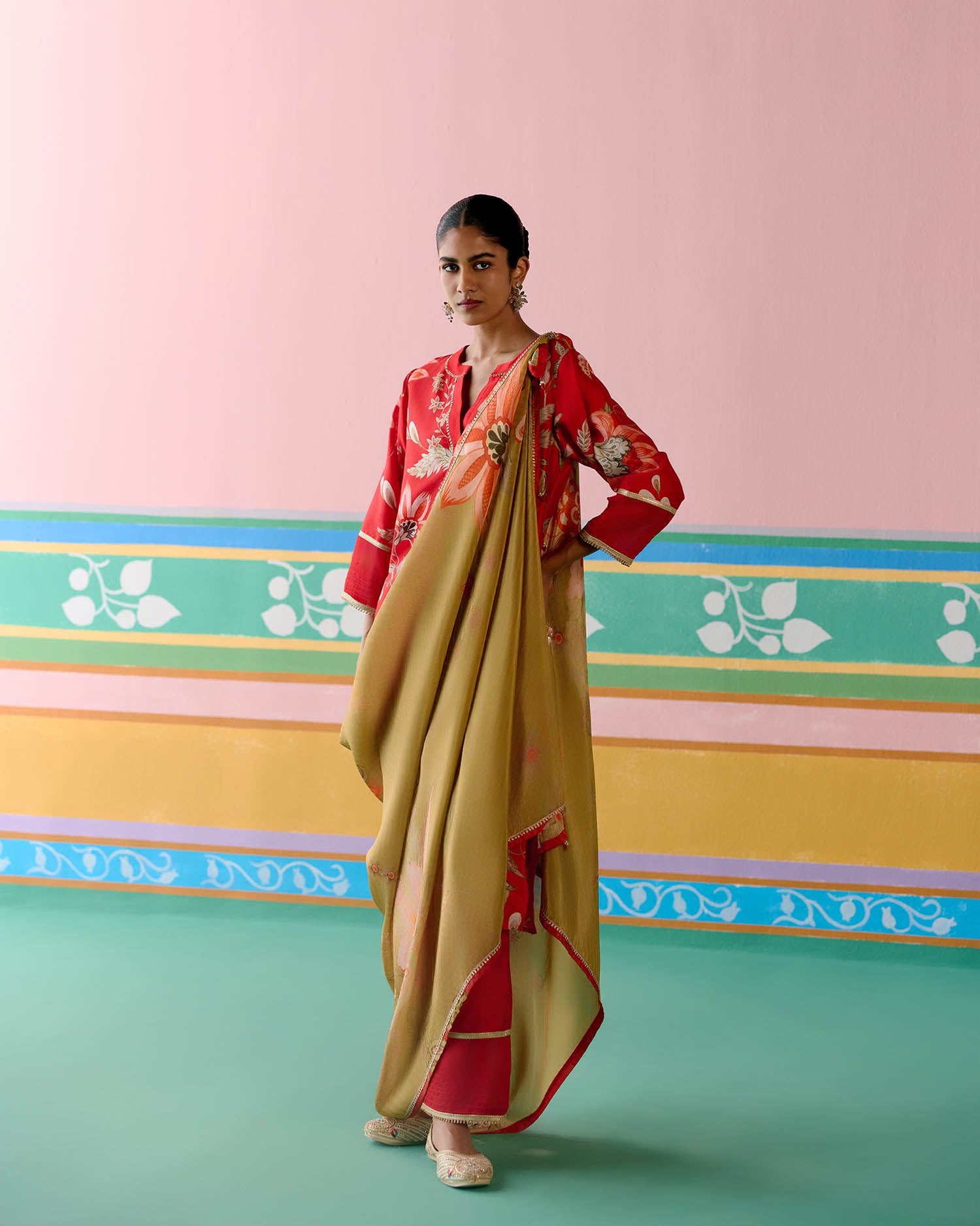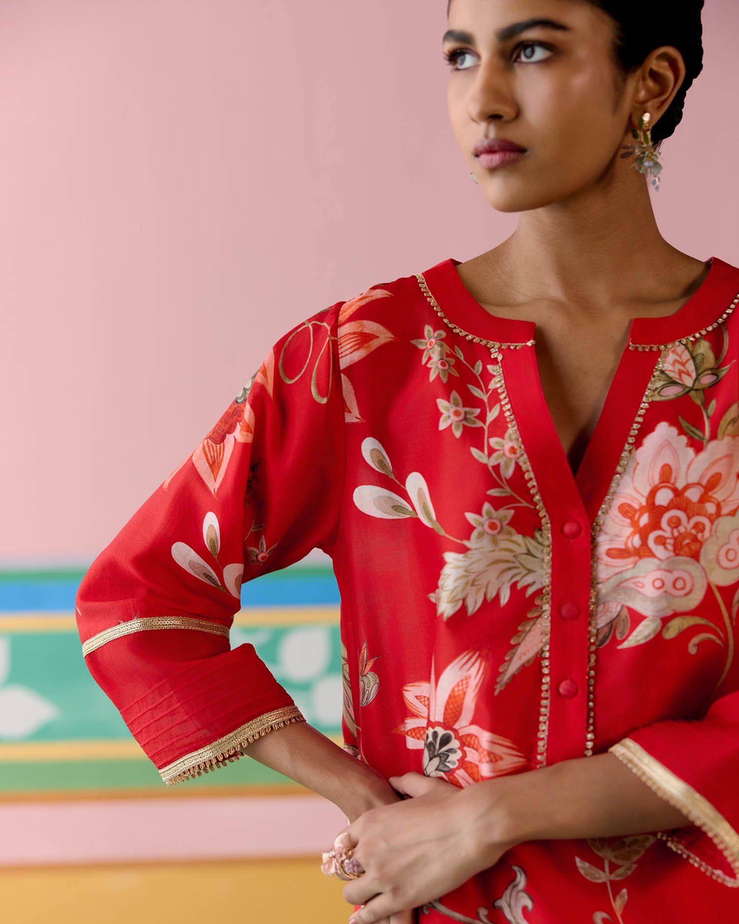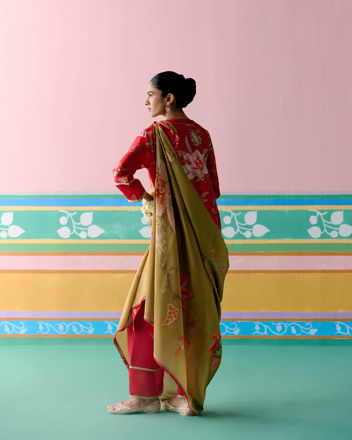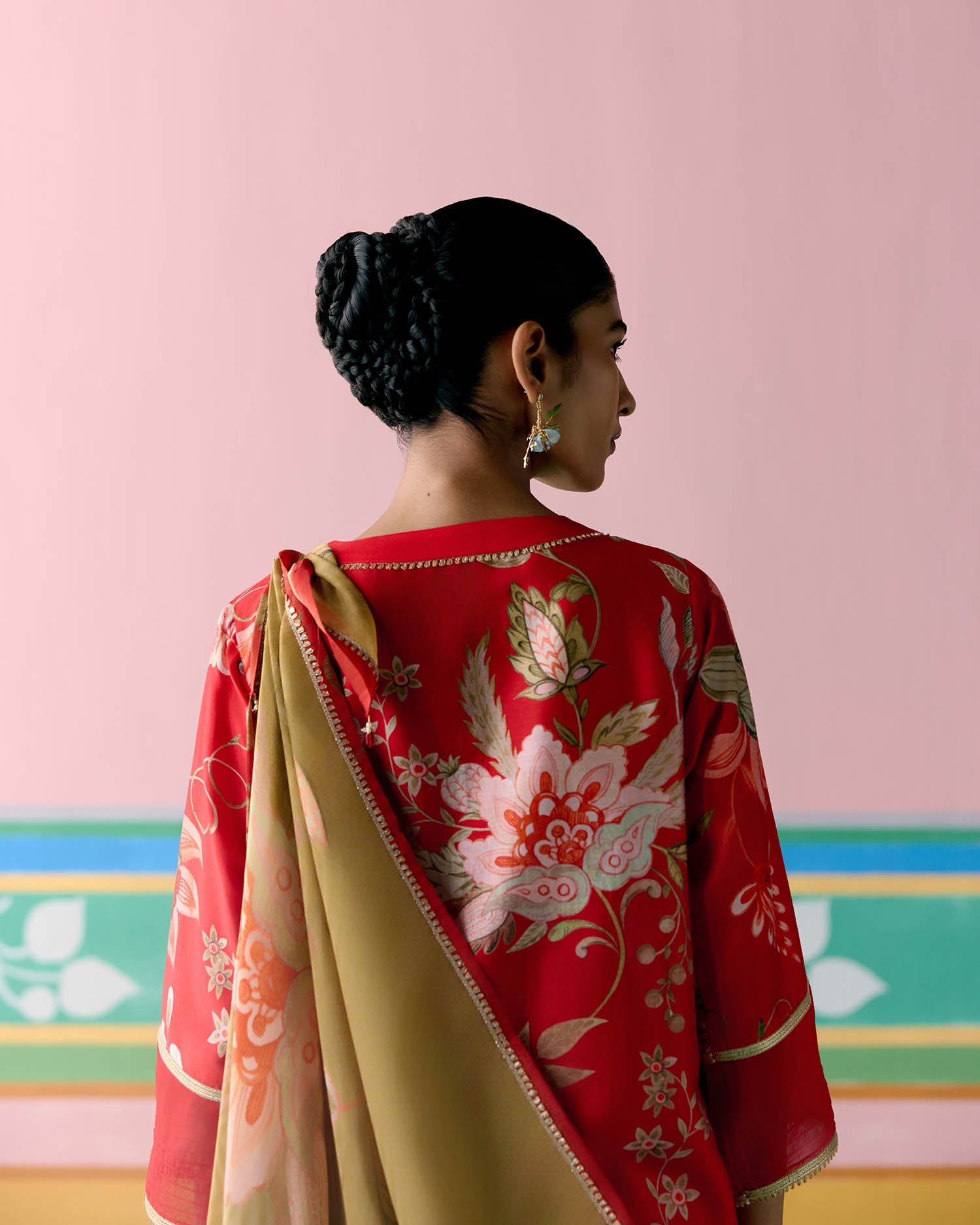 Elegant yet contemporary, the Red Chintz V-neck Kurta Set is a true festive standout. Crafted in airy Chanderi with delicate organza detailing on the sleeves and pants, the kurta is elevated with lace inserts along the neckline and sleeves.