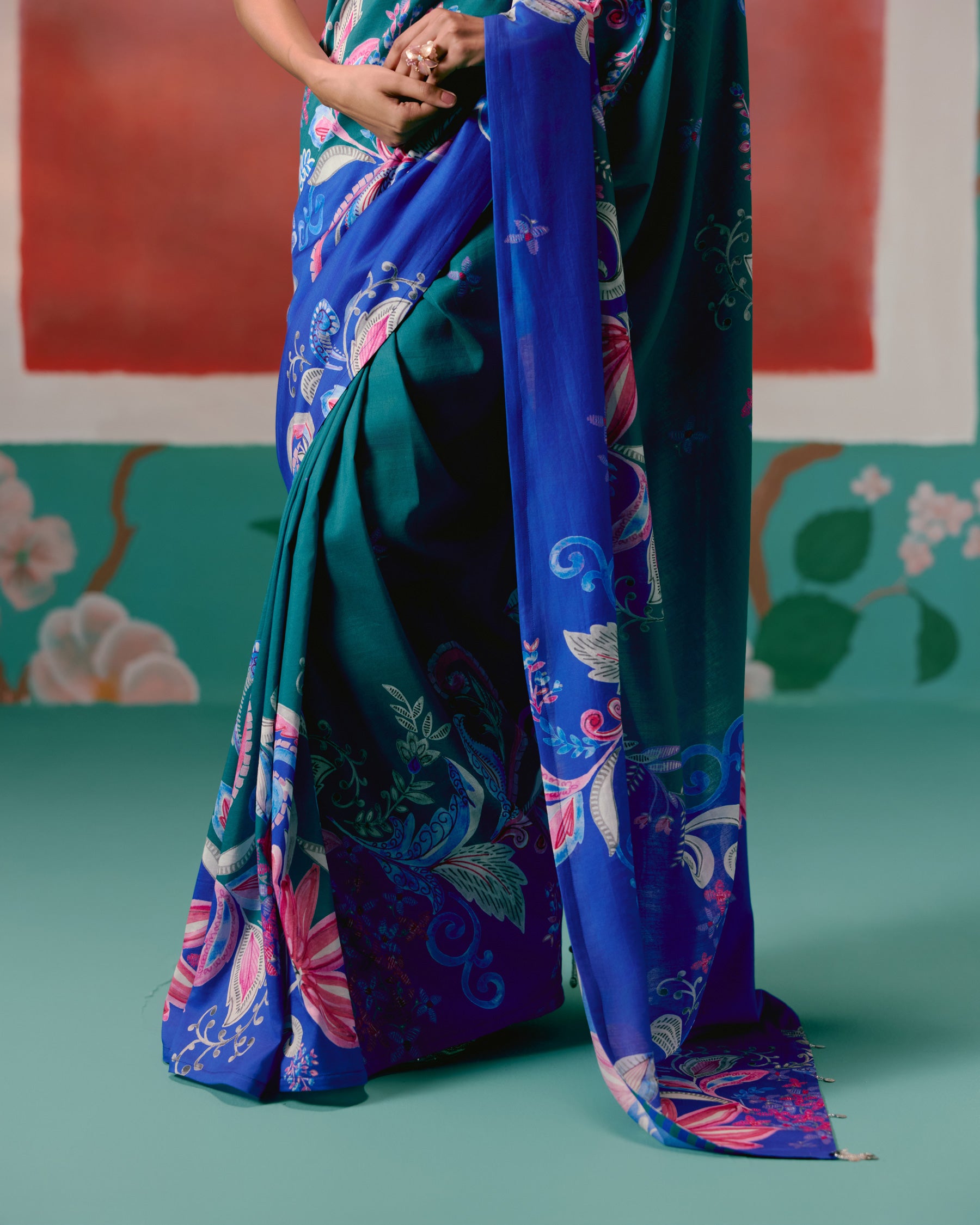 A timeless pairing of teal and blue defines this Chanderi saree, featuring intricate paisley motifs across its border.