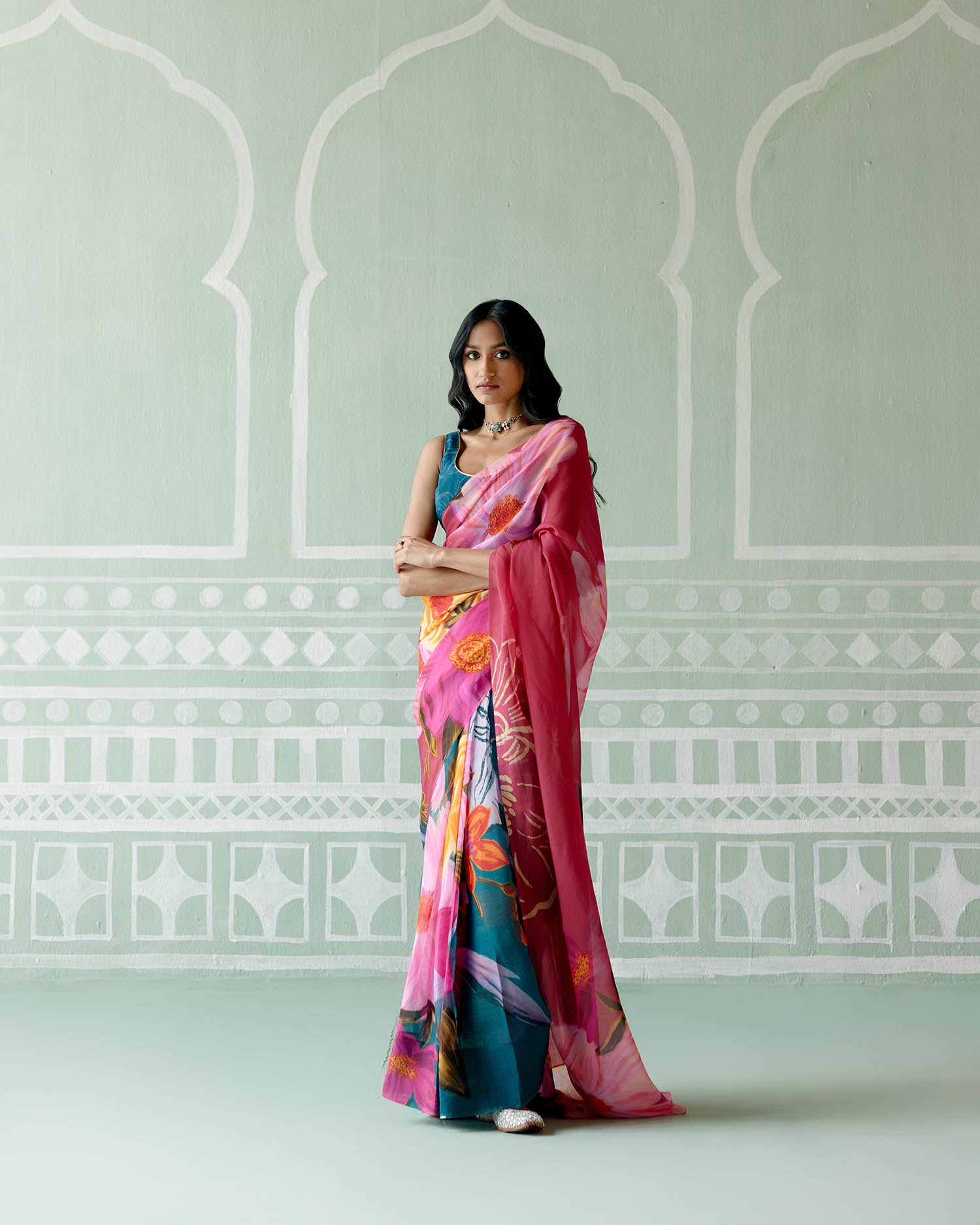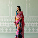 Our printed Teal and Fuchsia saree is the epitome of timeless elegance. A modern take on floral, this lightweight organza saree is perfect for anyone looking to make a statement with effortless grace. The saree is accompanied with a blouse piece!