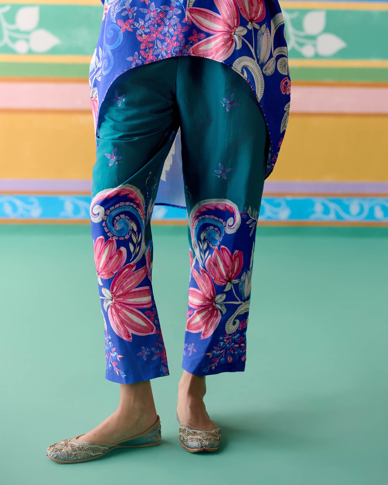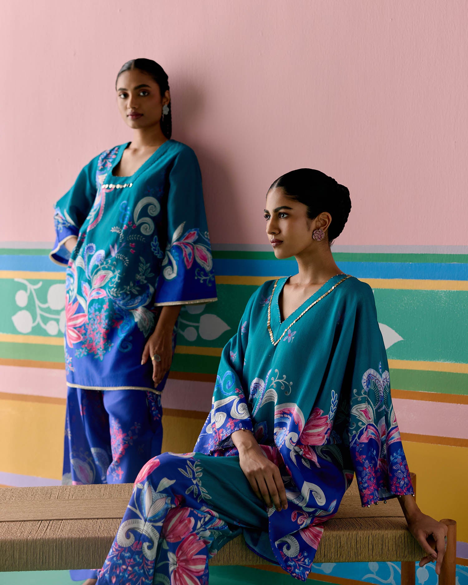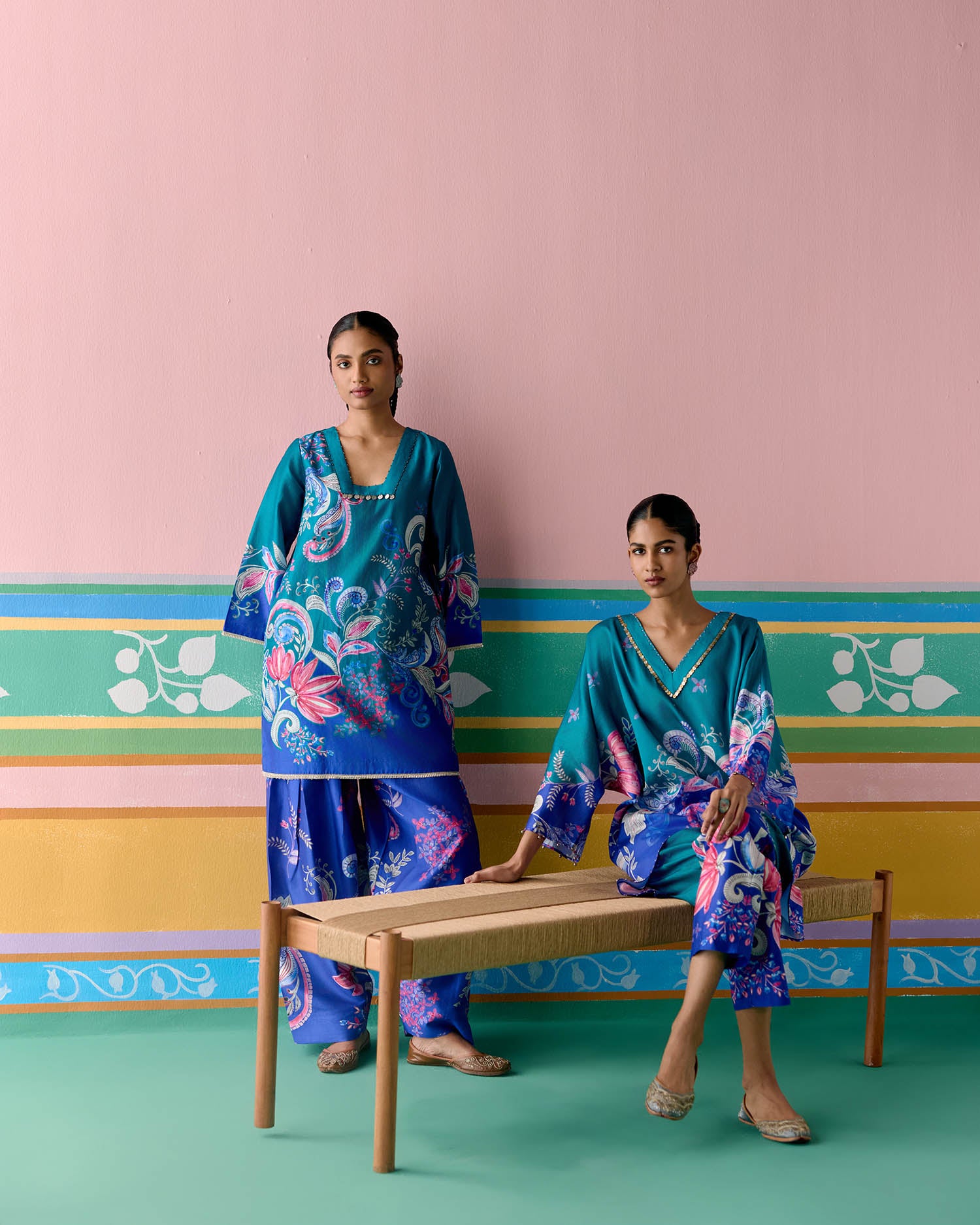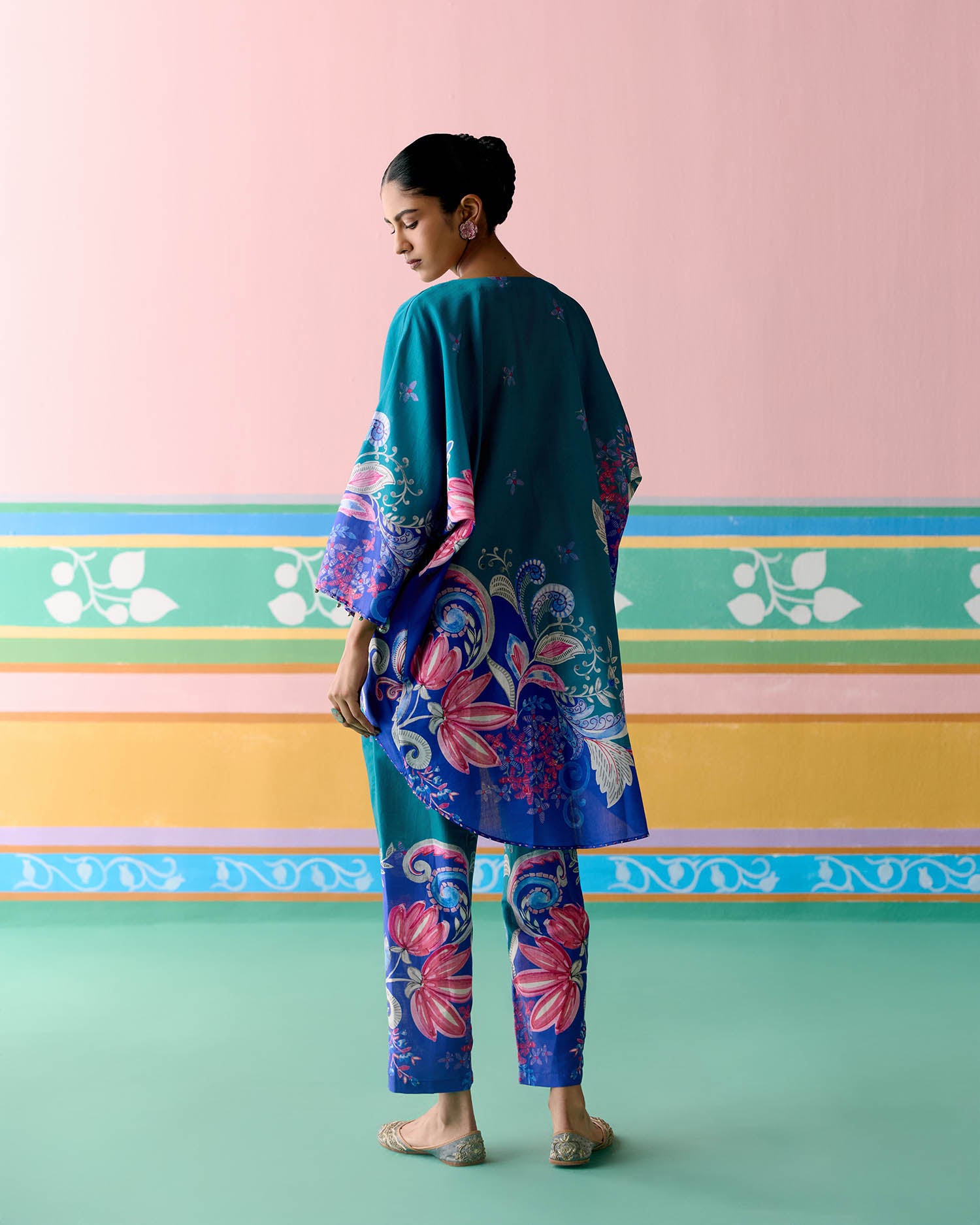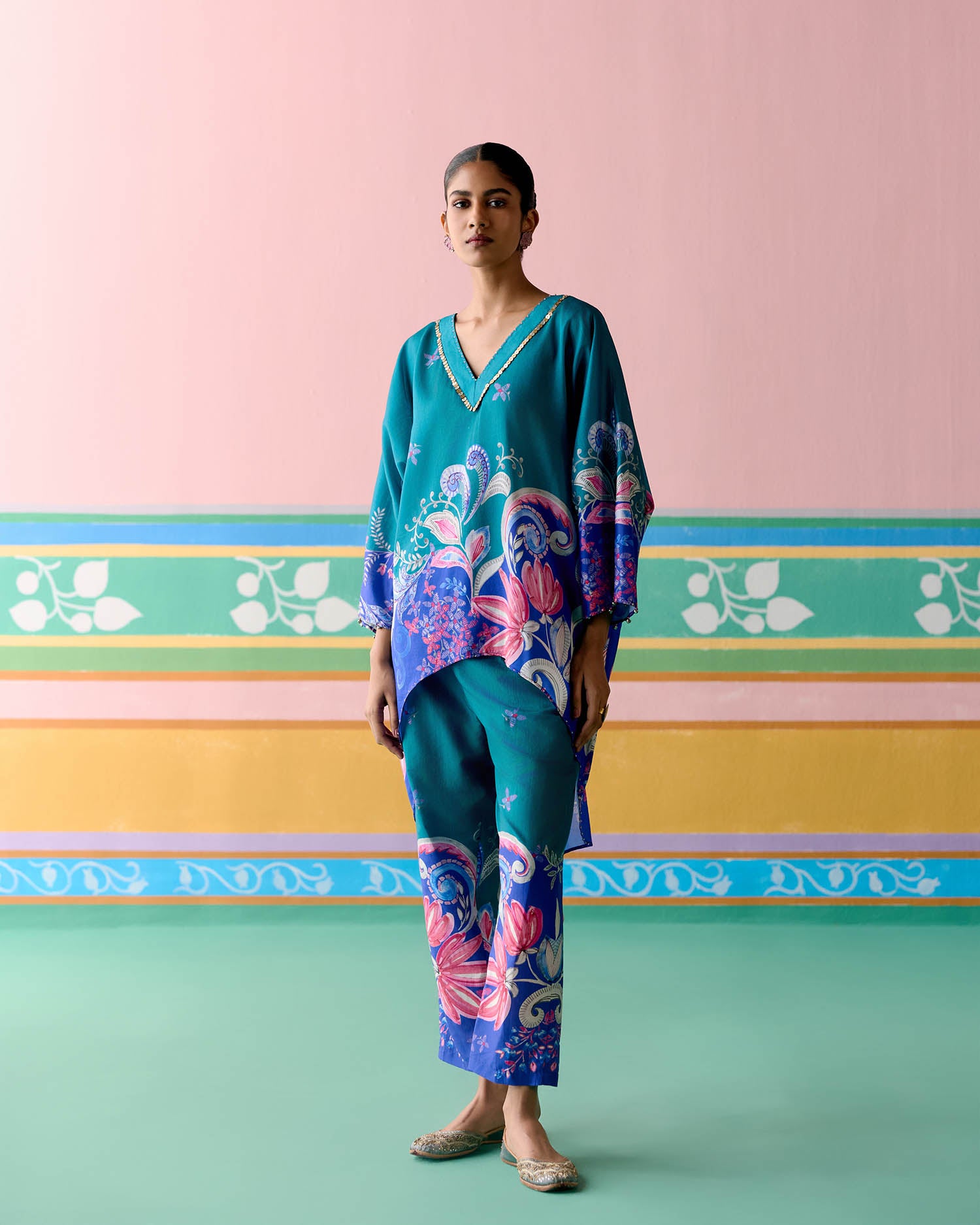 Fresh and festive, the Teal Paisley Kaftan Set is crafted in airy Chanderi for a light and graceful appeal.